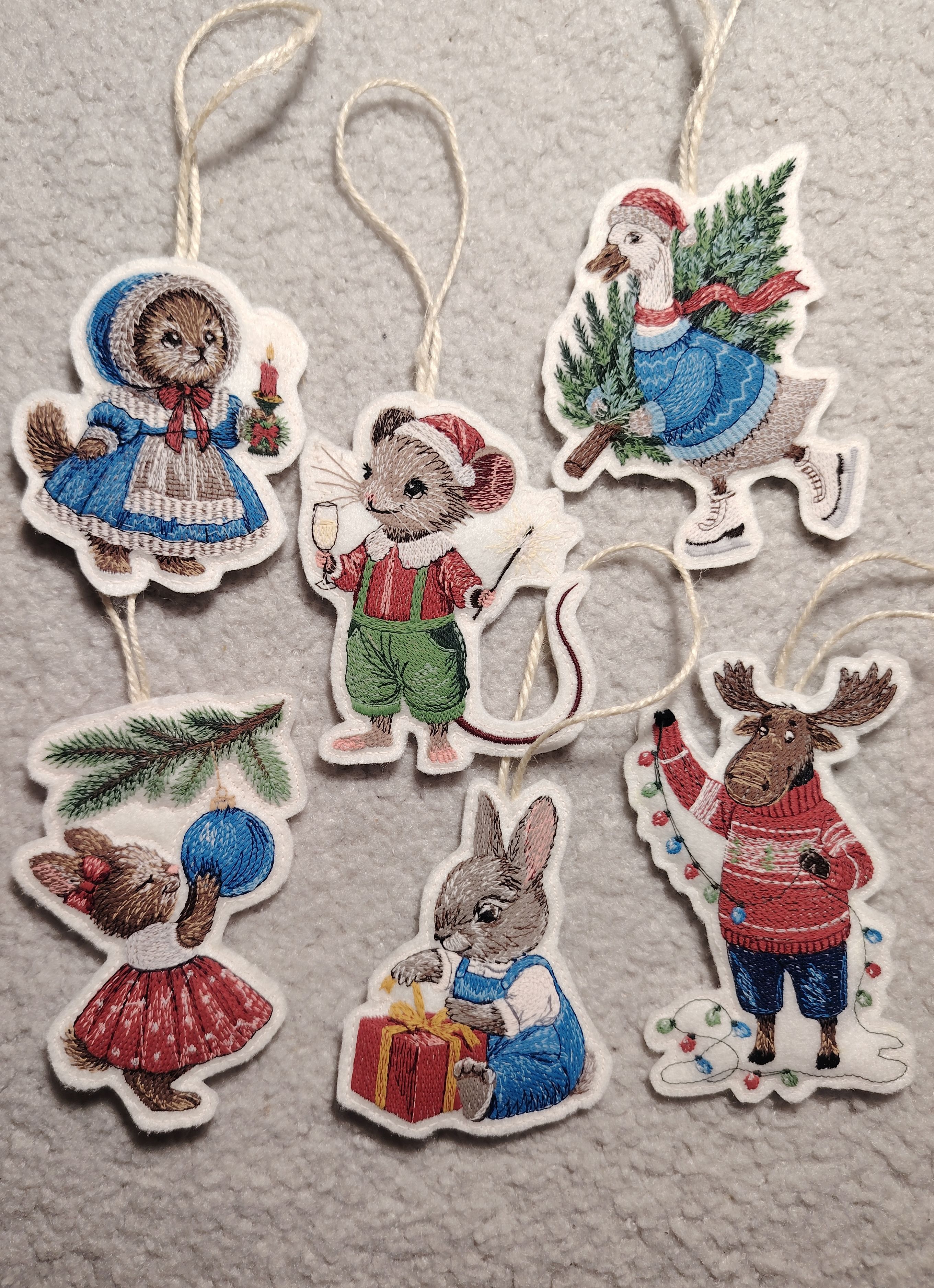 Бродирани коледни украшения, които ще придадат топлина и уникален стил на вашата празнична украса. Комплектът съдържа шест играчки, опаковани в кутия.Размери 8-11 см